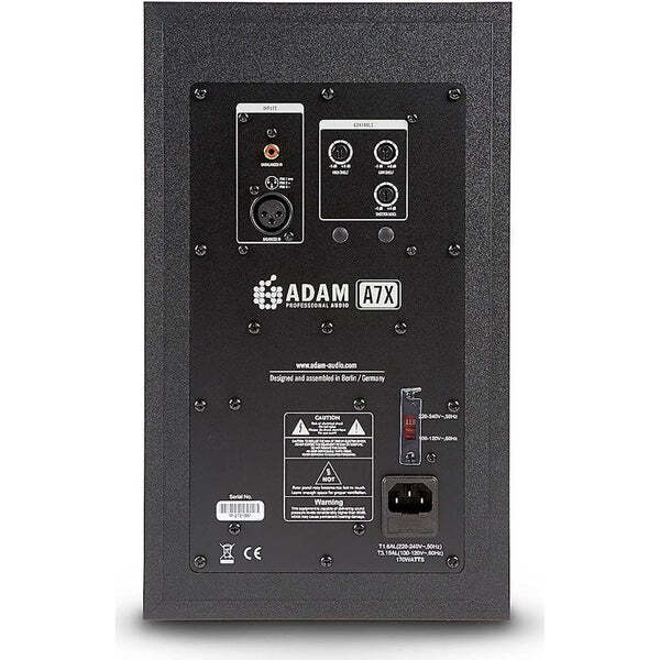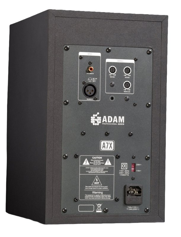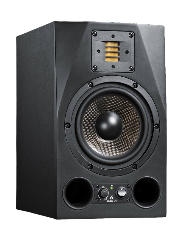 The A7X‘s ability to exactly reproduce every sonic detail no matter how small, its translucent sound image, tonal depth and stereo localization inspires music producers and explains why it is by far the most reviewed and award-winning monitor in recent years. Cabinet- and bass reflex-construction Like the other AX-Series models, the upper corners of the A7X are slanted to minimize reflections. The very large, double bass reflex tubes on the front have been specifically designed to perfectly match the midwoofer with its large voice coil. Amplification and controls The tweeter is driven by a 50 Watt A/B amplifier and the bass/mid-woofer by a 100 Watt PWM amplifier. This achieves a very clean and nuanced reproduction of the midrange frequencies with a seamless transition in the crossover from the 7" woofer, which operates in the range of 42 Hz to 2.5 kHz, towards the handmade X-ART tweeter. Besides the volume control and power button on the front panel, the rear panel offers several more controls: a gain for the high frequencies (4 db) and two shelf filters for the high and low frequencies. |