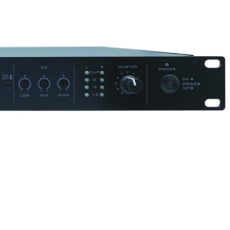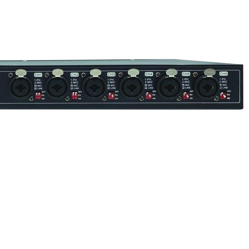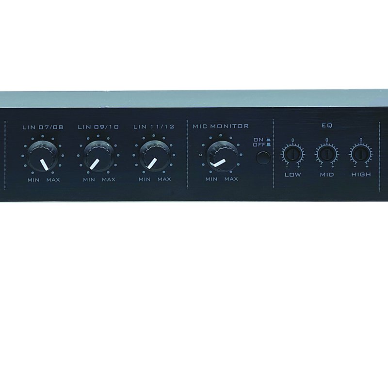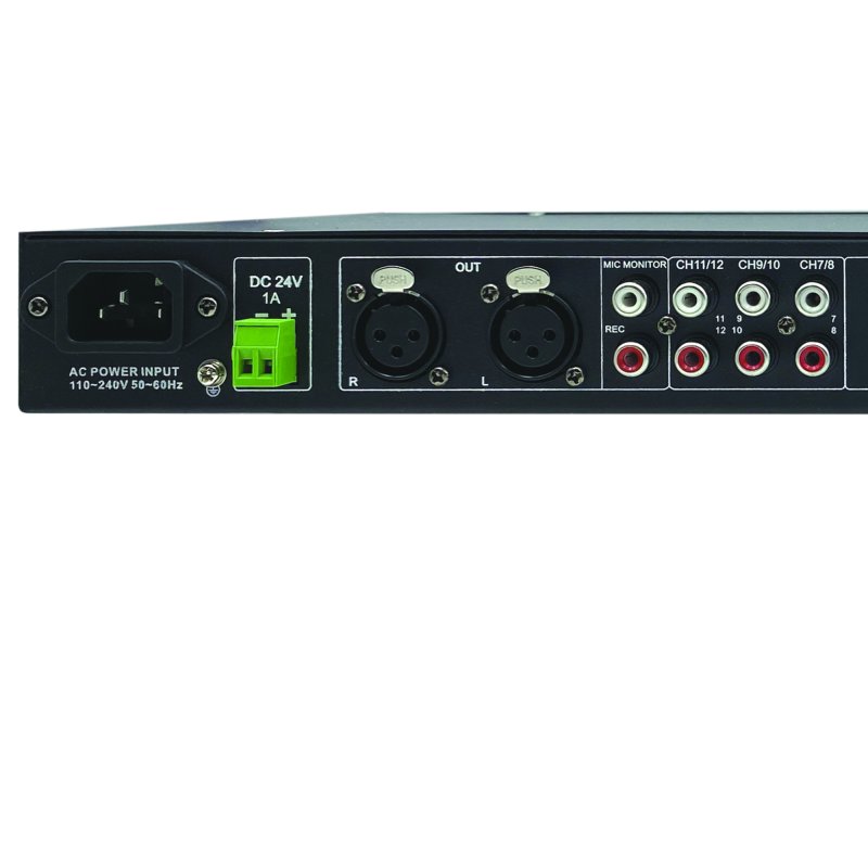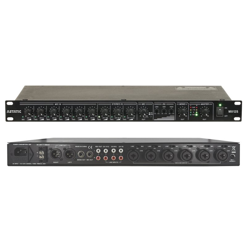 The MX12S is a 1U rack-mounted 12-channel mixer with 6 XLR combo inputs and 6 mono/3 stereo RCA inputs. The MX12S features a channel 1 priority, which can mute all other mic channels when a signal is present on Mic 1 channel, if desired. The front panel offers volume controls for channels 1 through 6 as well as stereo channels 7/8 to 11/12. Additionally, there are dedicated volume controls for Mic, Mono, and Master output. A master 3-band EQ offers cut/boost controls for high, mid, and low frequencies. Other features include balanced XLR outputs, mono ¼” output, and 18V-21V phantom power. The MX12S is well suited for live performance, karaoke, bars, clubs, studios, and more. |