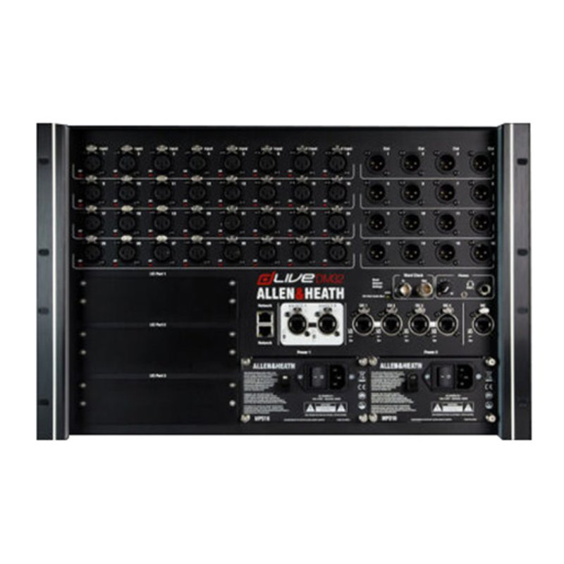 The Allen & Heath dLive AH-DLIVE-DM32-RUFX MixRack Stage Box is designed for professional touring, broadcast, and permanent installations, with dual power supply slots for redundancy, and dual redundant audio connections.