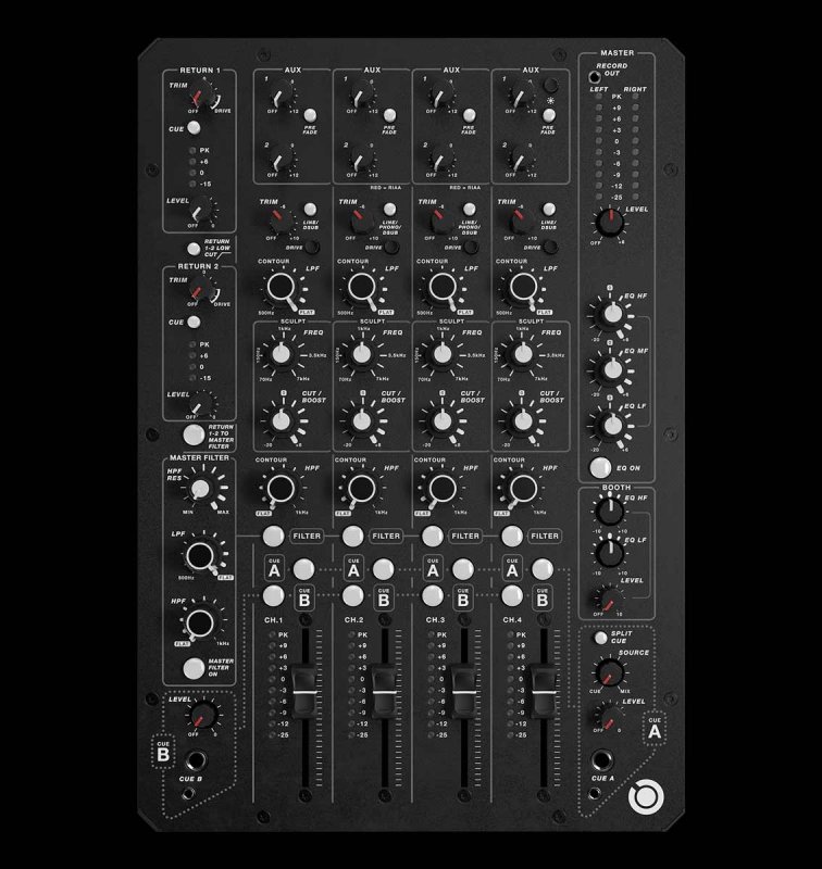 Custom TKD 60mm faders. These twin rails faders have been carefully chosen to ensure long life and smooth operation and feature a heavy feel for greater precision.