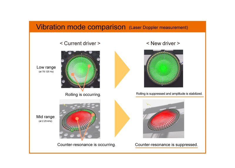 The BioDyna driver, which has been highly acclaimed for its high resolution and extremely smooth sound quality, has been significantly upgraded. The newly developed edge improves amplitude stability, enabling tight and well-defined low frequencies without excessive expansion. Furthermore, by suppressing unwanted resonance, it eliminates muddiness caused by extrane-ous noise, achieving a natural and smooth midrange. Enjoy high-density, clear, and smooth sound quality that preserves volume and depth, with tight low frequencies, transparent and clear midrange, and lustrous high frequencies, delivering every detail of the music.