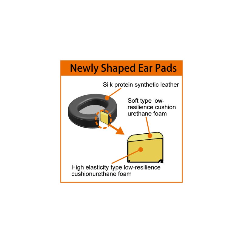 The new ear pads are designed with a slanted surface that optimizes the fit. The low-resilience urethane inside is made of two layers, with a soft type on the outside and a highly resilient type on the inside to fit the shape of the face. In addition, the use of silk protein synthetic leather, which is three times more durable than conventional materials, ensures a comfortable fit even during long periods of listening.