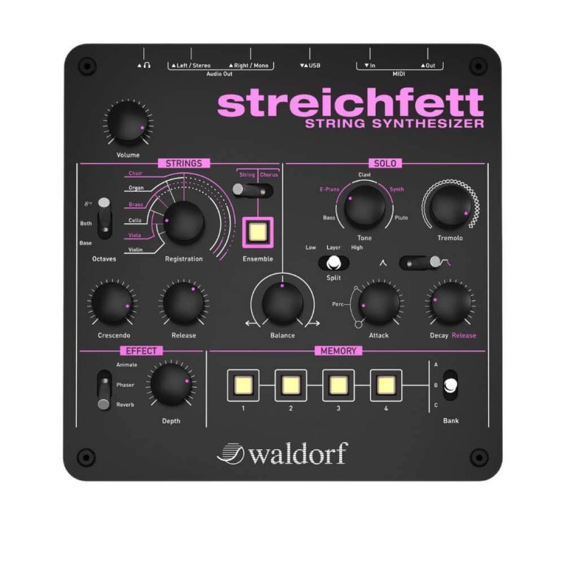 Streichfett combines the best of the previously extinct species of String Synthesizers of the 70s and early 80s. Its dual sound engine features a fully polyphonic strings section and an eight voice solo section, which is essential for recreating classic movie sounds from the 70s and 80s. The Ensemble Effect provides depth and movement to the String Section, while the Effects section adds adjustable Phaser and Reverb. Additionally, the Animate Effect can be used to modulate the strings registration, allowing spectacular sound morphs. The Solo Section offset presets named Bass, E-Piano or Clavi, and just like in your typical string machine, the sound has little to do with that name. Instead, these are shimmering and slightly percussive sounds that blend well with the string section. Although the User Interface is simple and easy to comprehend, it controls a rather complex sound engine which is capable to deliver rich and creamy pads unlike any other instrument. Twelve patches can be stored and selected in the Memory section, USB and MIDI are of course on board. |