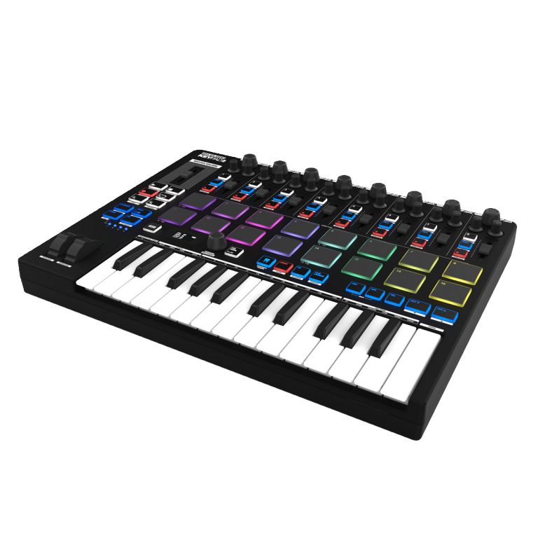 Keyboard with 25 mini keys across nine playable octaves.