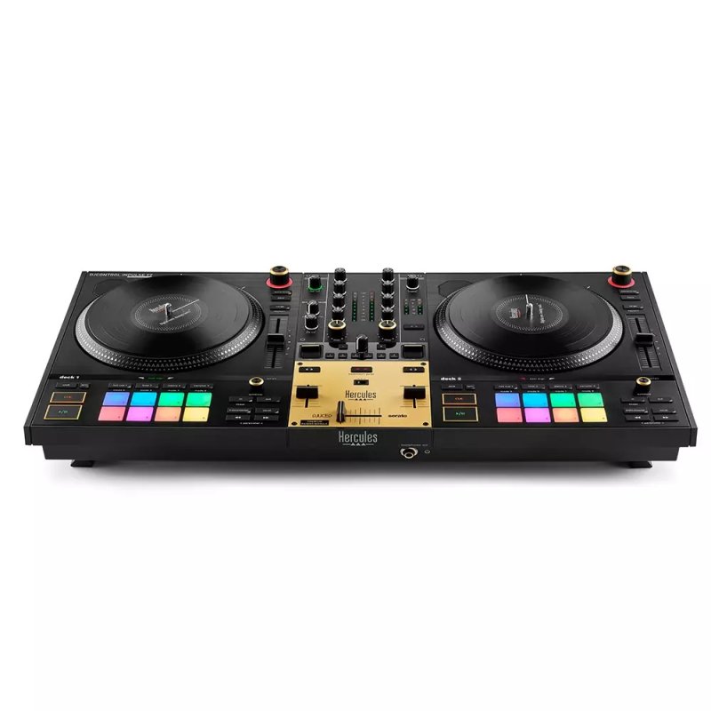 The DJ controller that helps you learn how to spin on vinyl Whether you're digging into the latest hits or building deep crate-digging sets, you can stream millions of tracks via built-in music streaming support in both DJUCED and Serato directly from platforms like Apple Music®*, Beatport, Beatsource, SoundCloud, Spotify* and TIDAL**. No downloads needed. To complete your DJ setup, you can connect your PC or Mac to the DJControl Inpulse T7 Premium and use free included DJ software like DJUCED or Serato DJ Lite. You can buy a licence or subscribe to the premium version of Serato DJ Pro if you want to improve your experience with it. DJs wield the power to blend and beatmatch with precision, courtesy of the standard-sized 7″ platters that leap from 0 to 33⅓ RPM in the blink of an eye.The magic doesn’t stop there – they can even liberate the cherished vinyl discs and the velvety scratch slipmats from their metallic embrace, recreating an authentic turntable sensation in a digital format. Stems – the magic, real-time audio separation tool that should be at the disposal of every DJ. With one-button controls to isolate vocals or instrumentals, DJs can easily create personalized mixes on the fly.There is truly no limit to the imagination when it comes to creating new mashups or blends. Available in DJUCED and Serato DJ. Boasting a trio of FX Select buttons, a paddle, and a Filter knob per deck, along with an additional control knob and Beat -/+ buttons, the DJControl Inpulse T7 Premium provides users with the tools they need to fine-tune their mixes and transitions to perfection using a plethora of effects. The DJControl Inpulse T7 Premium weighs only 11 lbs, so you can carry it with the included bag anywhere you go. It also comes with retractable feet so you can run wires underneath and protect your controller from spilled drinks. No more calling you DJ Backpain, promise. Each fader on the included and already installed Premium Fader Module on the DJControl Inpulse T7 Premium slides on 2 rails for better, smoother movement than the stock faders on the DJControl Inpulse T7.The 3 double-rail faders are built to last, so you can focus on your music, not your equipment. Placed between the motorized jogwheel platter and the vinyl record, the included Scratch Slipmats insulate the records from platter vibrations and allow you to handle the disc without affecting the platter’s rotation.The DJControl Inpulse T7 Premium also come with standard slipmats, ideal for traditional mixing. ighter than hardened plastic, the semi-rigid EVA (Ethylene Vinyl Acetate) bag has a black lining featuring the Hercules logo embroidered in white and red. The EVA creates a solid shell which is softer than hardened plastic and won’t break on impact. Your controller and its power cables will fit into a foam cavity, making it safe to carry everywhere your DJ career takes you. The DJControl Inpulse T7 Premium, powered by a DC converter and connected to your laptop via USB, provides crucial master outputs (2 x XLR + 2 x RCA) for connecting to professional speaker systems.To meet your various audio needs, it also offers dual headphone connectivity options (1/8″ / 3.5 mm stereo mini-jack + 1/4″ / 6.35 mm stereo jack).